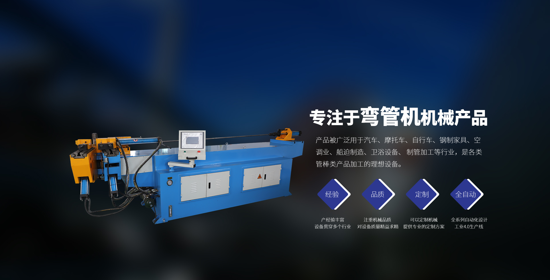 廣泛用于汽車(chē)、摩托車(chē)、自行車(chē)、鋼制家具、 空調(diào)業(yè)、船迫制造、衛(wèi)浴設(shè)備、制管加工等行 業(yè),是各類(lèi)管棒類(lèi)產(chǎn)品加工的理想設(shè)備。
